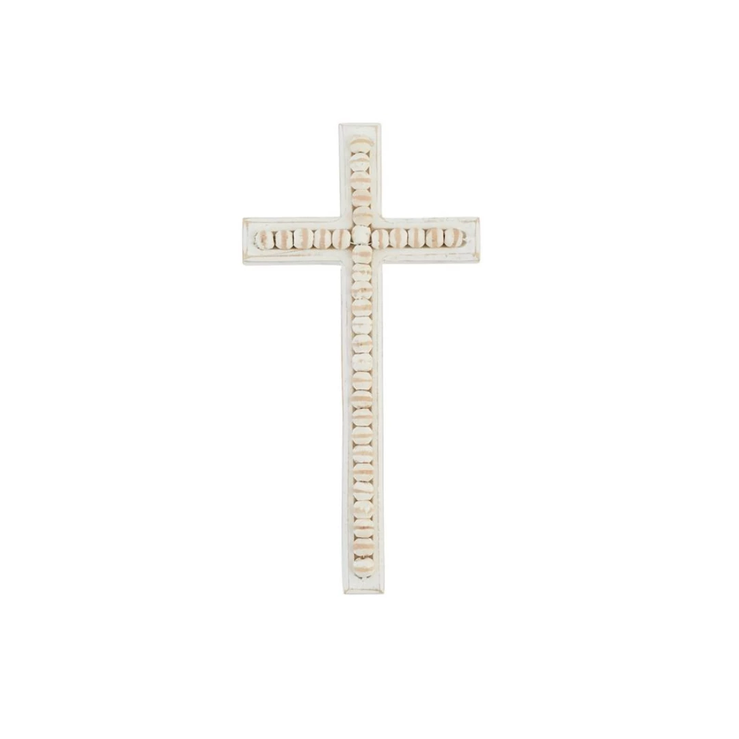 A lovely decorative piece and a perfect gift, our mango wood cross features a white-washed finish and a raised beaded center.