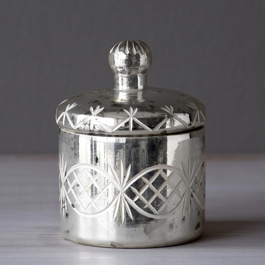 Modeled after a vintage canister, this lustrous mercury glass lidded votive holder features an etched scroll pattern and antiqued finish.Â