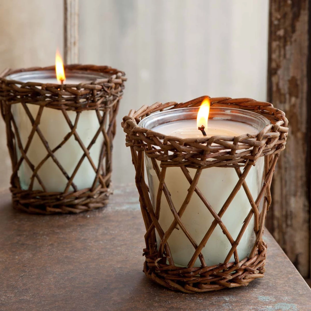 Our candles are blended with the highest quality oils and have a wonderful fragrance. They are made from a soy based wax and are housed in a glass jar. These candles’ jars are also encased in a beautiful wooden, woven casing.