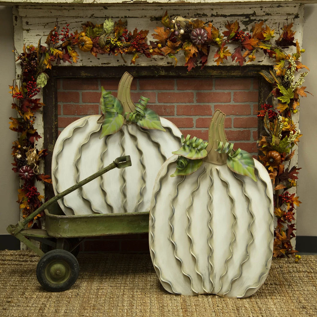 Whimsical large pumpkin decorations are ready to help you decorate for fall. Stake, hang, or display on an easel.