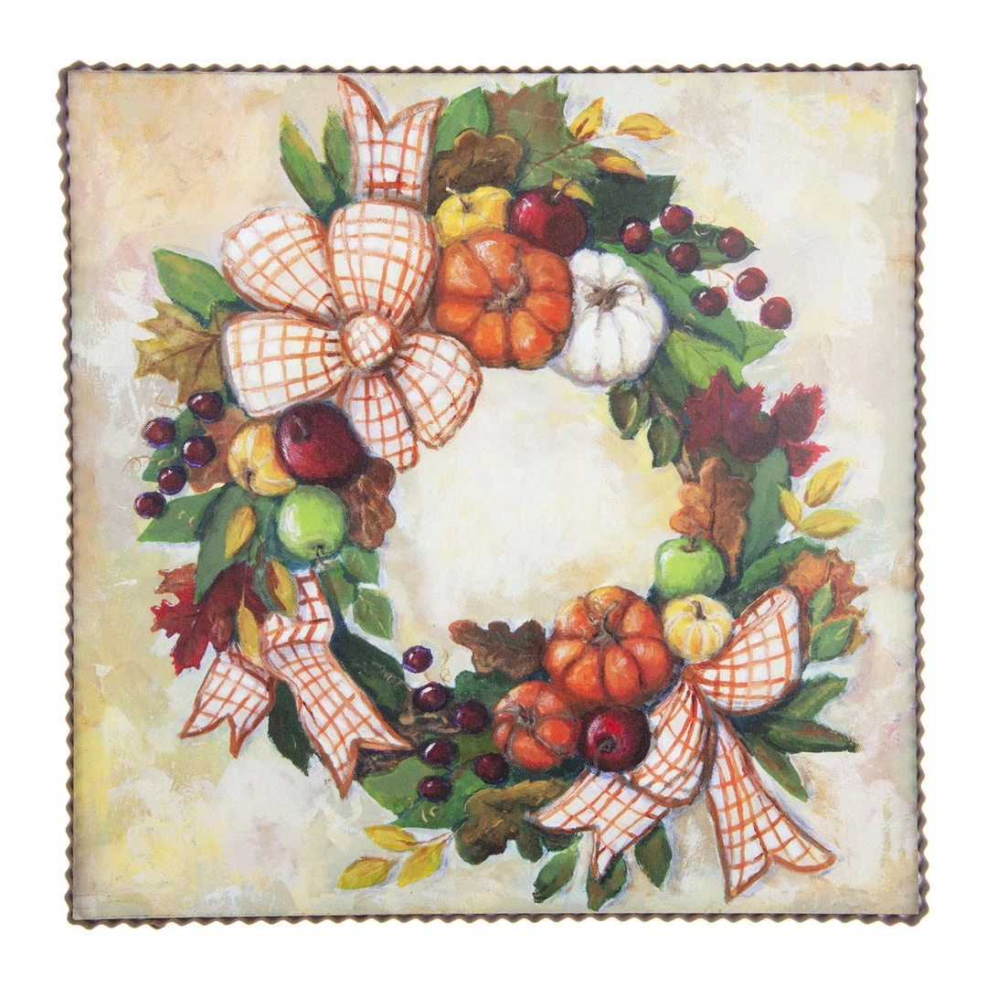 Celebrate the abundance of the harvest season with this pumpkin wreath print framed in ripple tin.
