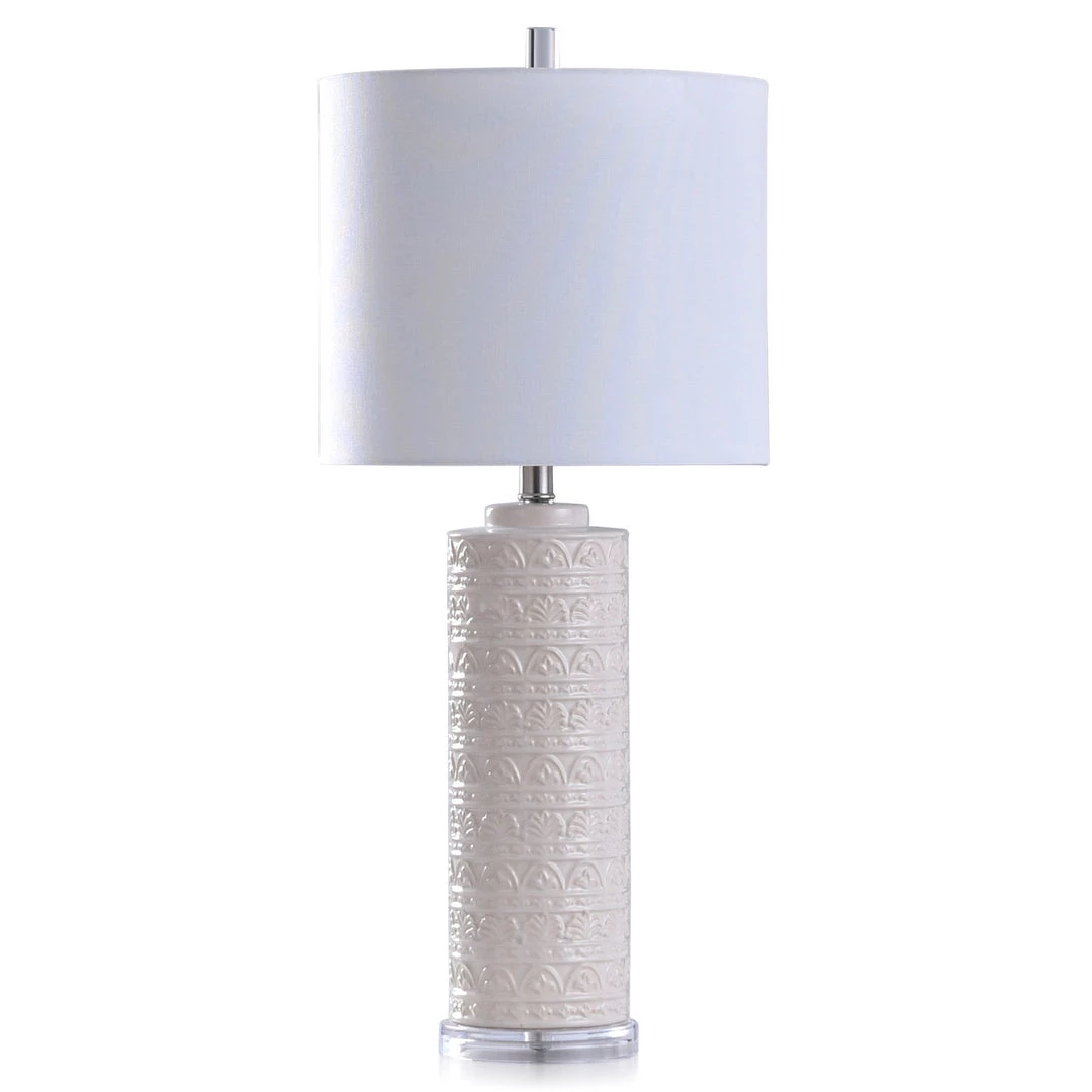 Beautiful ivory table lamp with a textured base and a fabric shade.