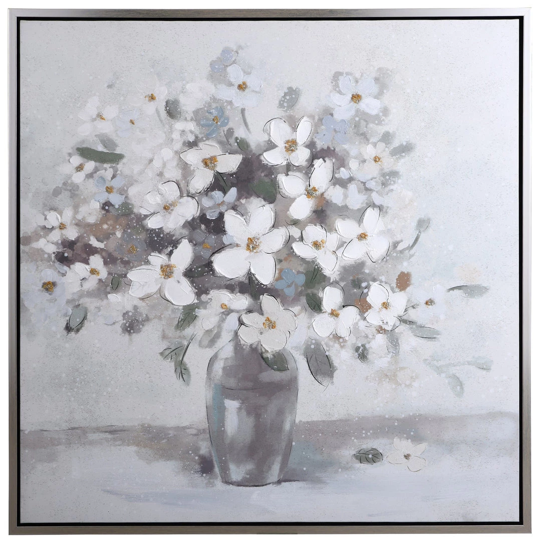 A beautiful hand-embellished framed canvas of posies in a glass jar, in monochromatic colors.