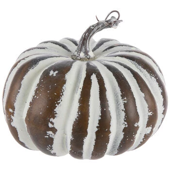 All the fall feels! Our realistic brown faux pumpkin with distressed white finish is just the thing for your fall vignettes. Pile several in a basket or wooden bowl. Set up a grouping with other colors on your porch, entry table, mantel or hearth.