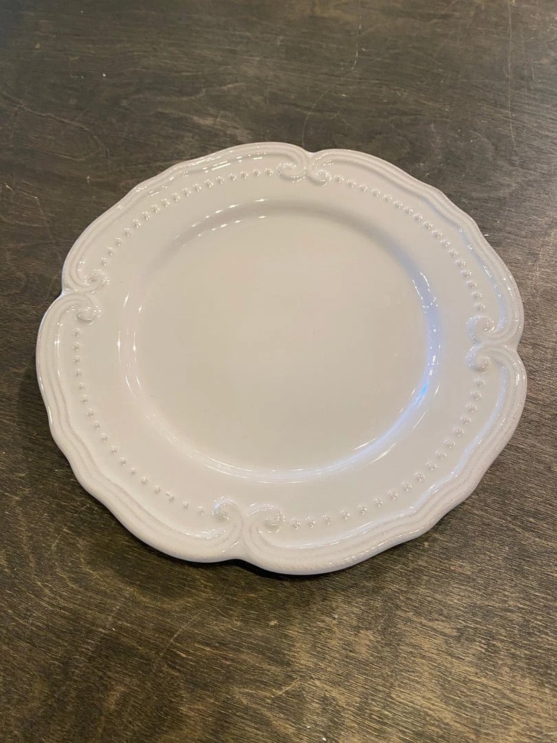 From formal holiday dinners to a relaxed meal with friends, this classic white salad plate (with gorgeous scalloped edges), is a great way to introduce a traditional touch to your meal. A set like this, constructed of dolomite, features an ornamental scroll and dot pattern. Both dishwasher and microwave safe, cleaning up after your guests have left (or reheating food for when the conversation runs long) is a breeze.