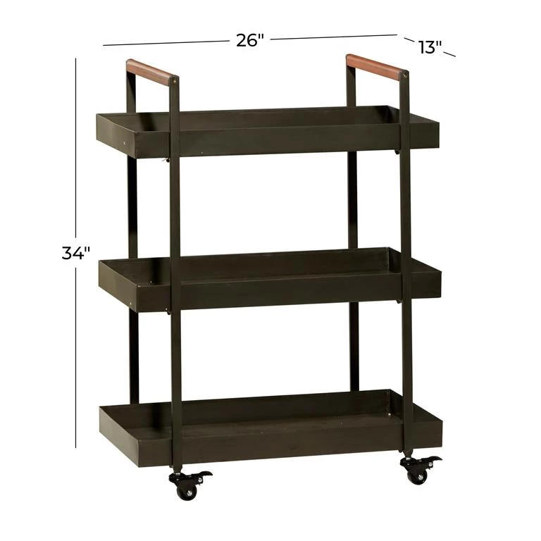 Enjoy this bar cart in your home while relaxing after a long day at work. A perfect addition to any living room or kitchen with contemporary interior. Or use to display your favorite books, photos, and memorabilia with style. Suitable for indoor use only. 3 shelves, each can hold up to 30 lbs. Contemporary design. Some assembly required.