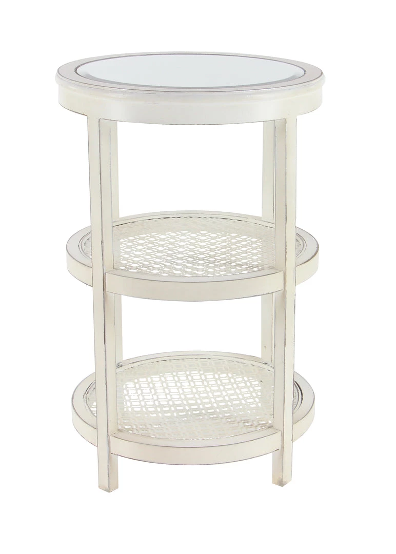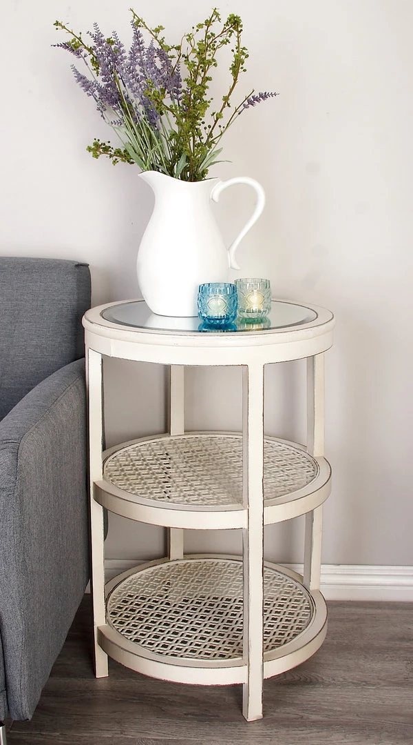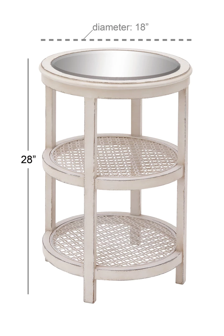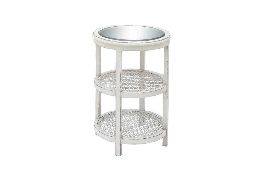 Forget the need to compromise on style or function with this tiered wood accent table. Mirrored top and two cane insert shelves. Whitewashed and distressed finish. Fresh and unfussy–just right!
