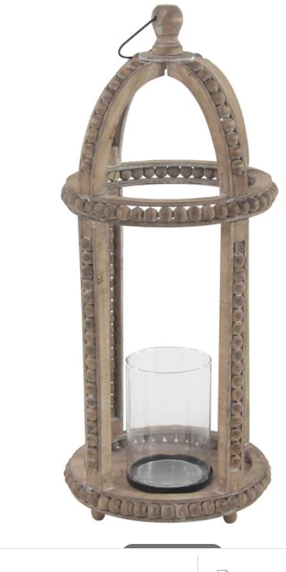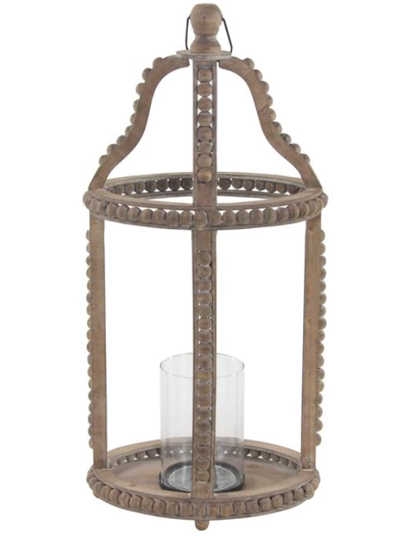 Gorgeous wood lantern features beaded trim and glass hurricane glass for your pillar candle. Available in two shapes: oval and round. Perfect for your mantel or hearth, entry or dining table, or porch or covered deck.