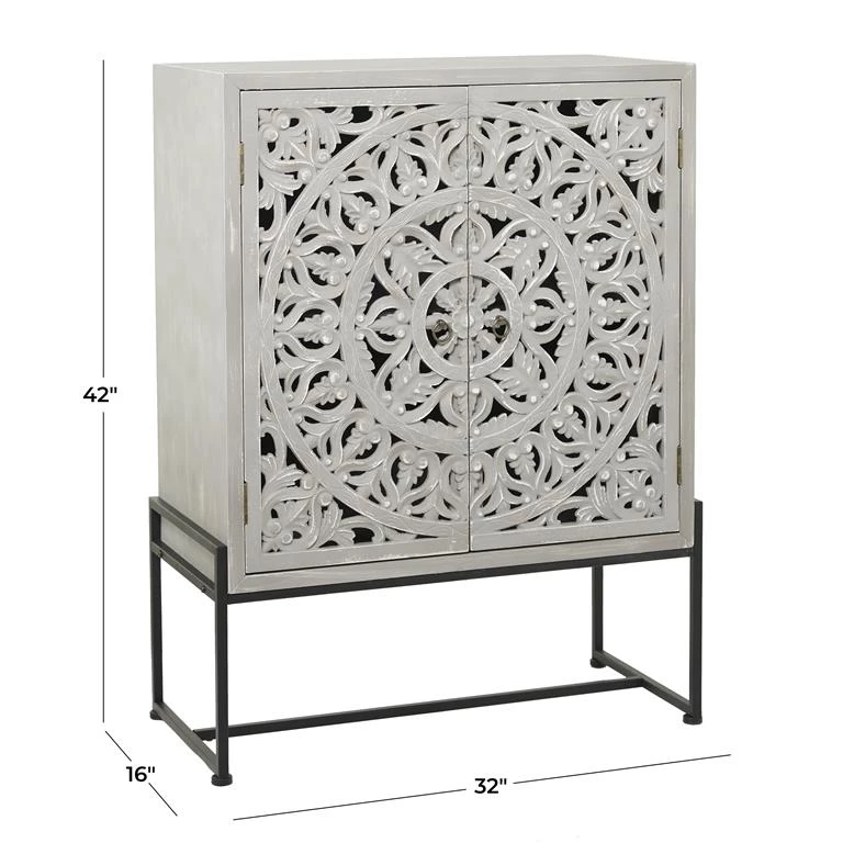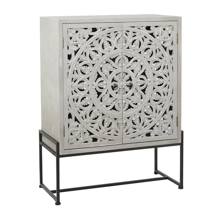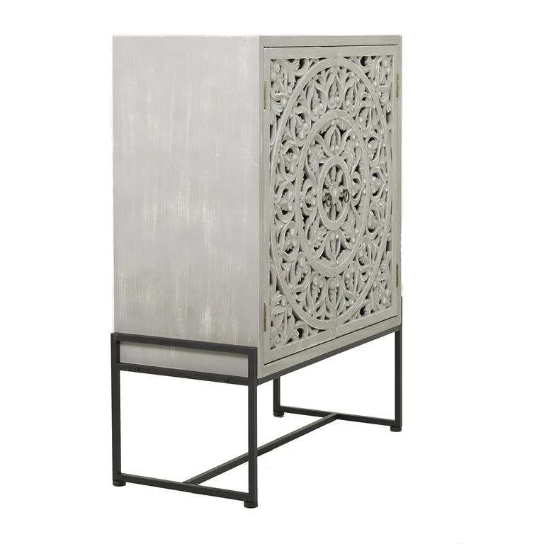 Our elegant white fretwork door wood cabinet will elevate the style of any room. Perfect for foyer, living, dining or bedroom. Set on a black iron base and with one interior shelf, it offers practical storage, as well. Comes with mounting hardware to prevent tipping.