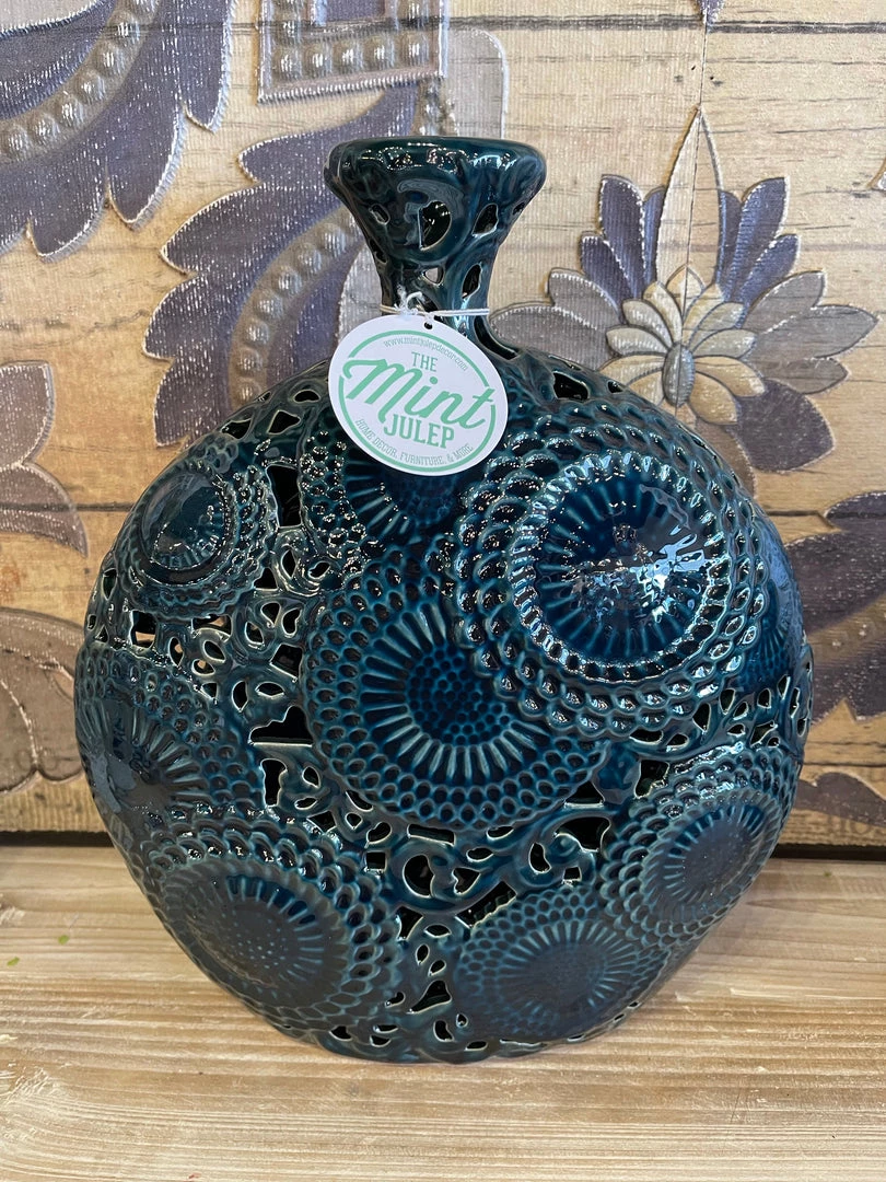 Fresh and unexpected, these stunning large openwork ceramic vases in navy are sure to delight. Their elegance will enhance your mantel, shelf or tabletop. Two sizes to choose from.