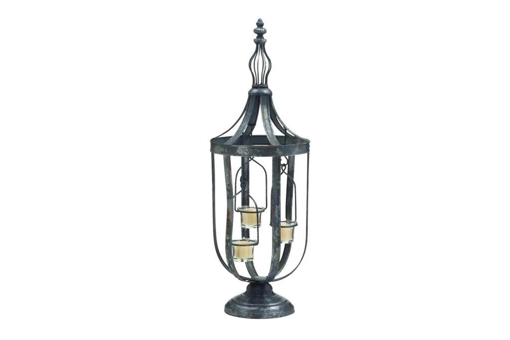 A striking accent piece for your console, hearth or coffee table, this open metal lantern features three hanging glass votive holders and a finial top. Transitional style works in homes from French country to modern.