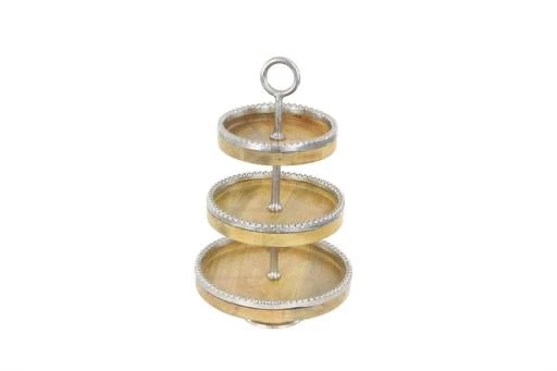 Our wood tiered tray features a stunning beaded metal rim, post and ring. Display and serve with this distinctive piece.