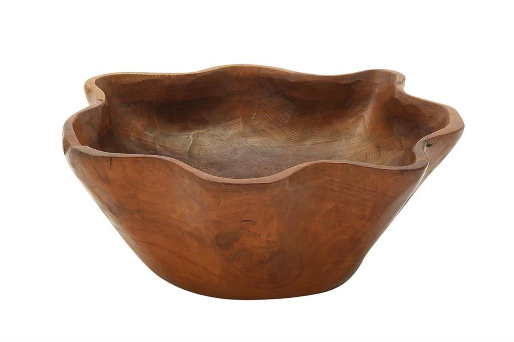We love the undulating lines of this artisanal teak wood bowl! Perfectly complements your interiors from boho to organic modern. Both decorative and functional, this striking carved bowl will be a favorite. Â