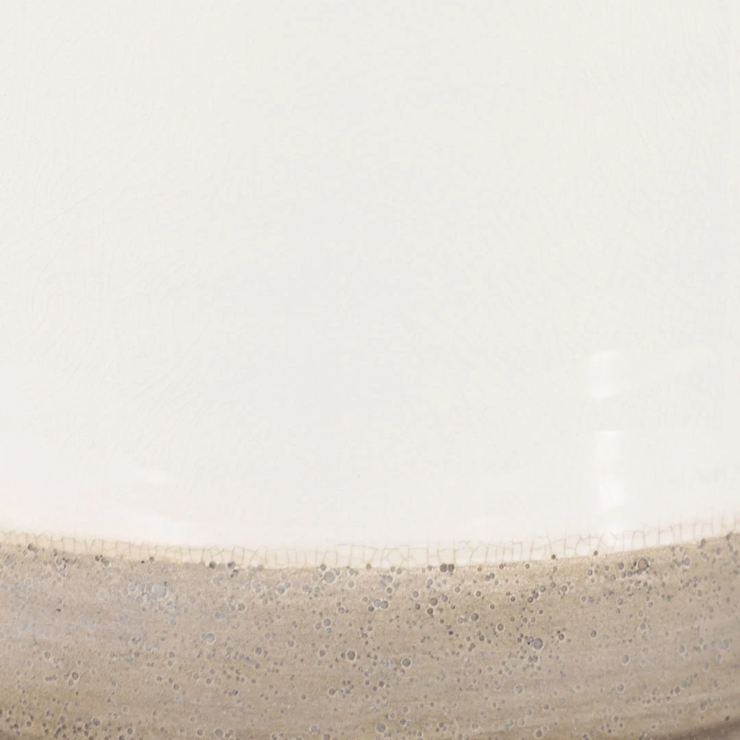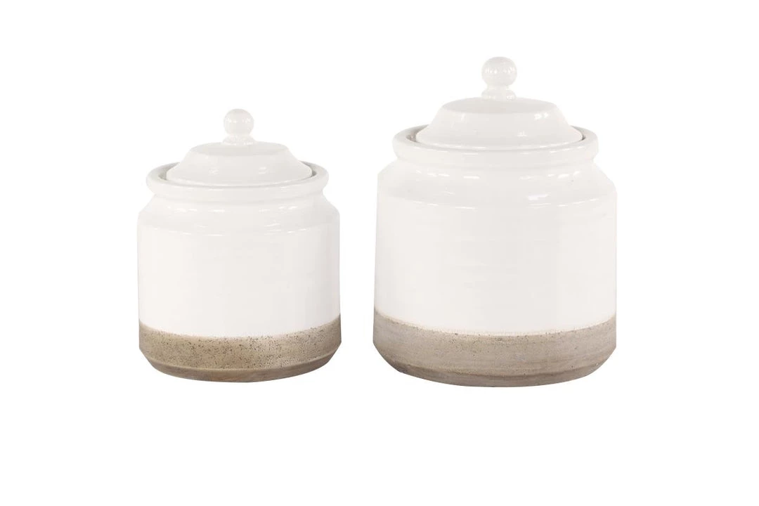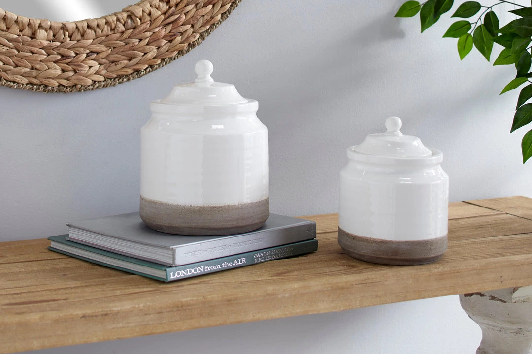 This ceramic jar duo features a decorative color block design in glossy white and matte tan glazes. Lidded canisters are great for a variety of uses in the kitchen, or to display.