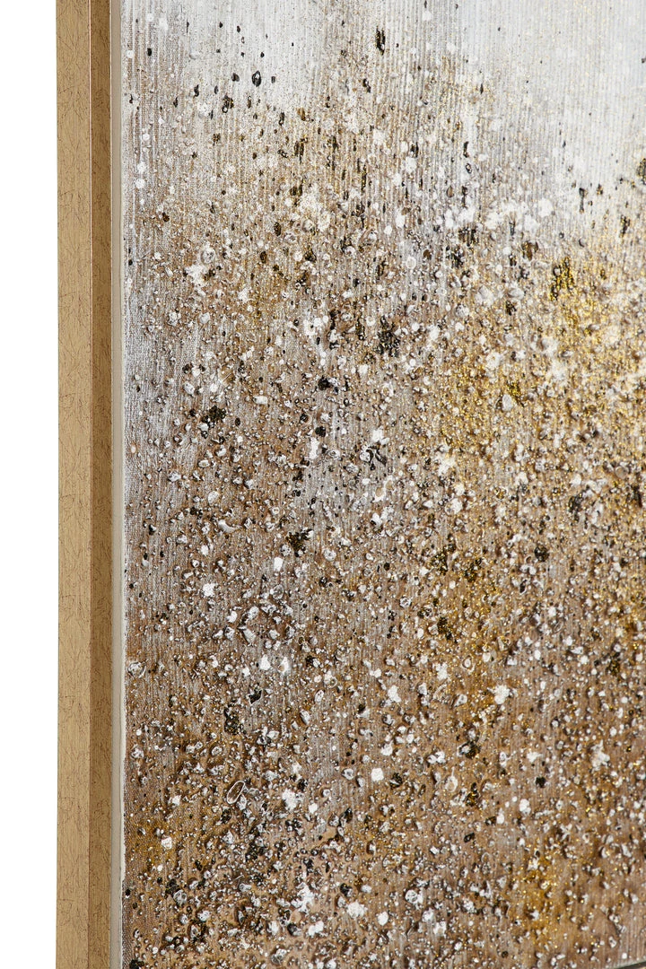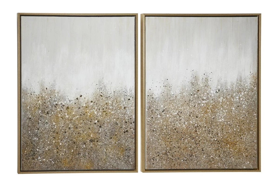 This set of 2 multimedia, gold and white abstract art paintings brings to life any room needing some illuminating, saucy art. White and black acrylic paint strokes and impasto technique on canvas gold glitter layers housed by distressed gold wooden frames
