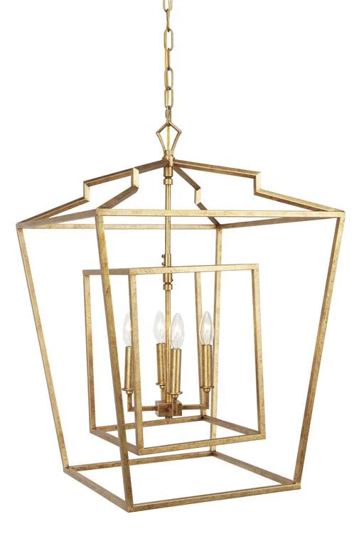 Bring bold, sophisticated style to any room with this modern, gilded pendant. Our large textured gold-finish lantern pendant features 4 tapered candlabra lights. Imagine it in your dining or breakfast room, over your island or your soaking tub!Â