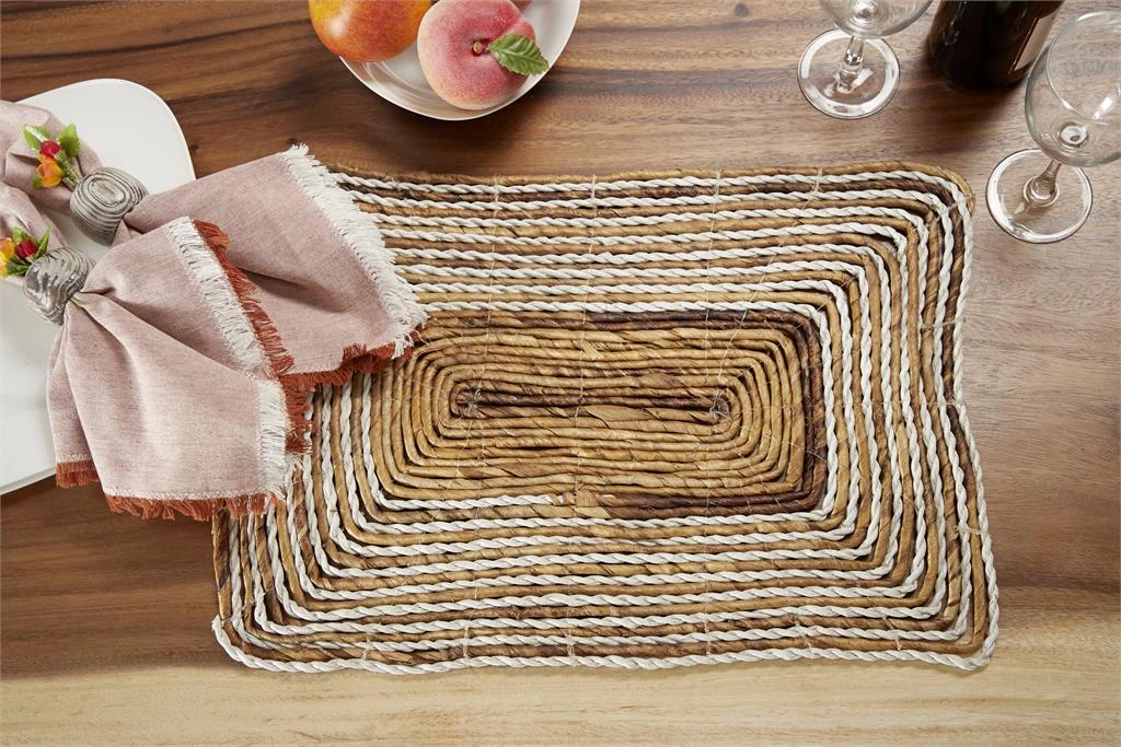 Bring natural decor to your space with this plastic and wicker placemat set. The wicker and plastic twisted cords are held in place by a clear acrylic string that forms a subtle, yet lovely, spiral design on the top of each placemat.