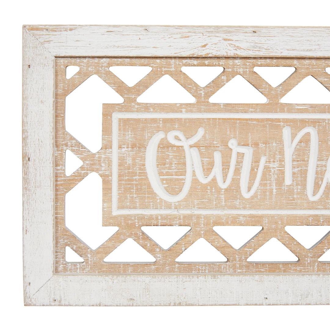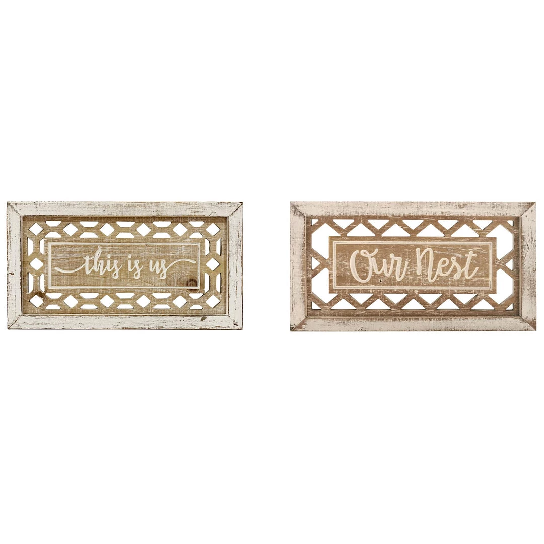 Hang or prop these adorable weathered signs wherever you need a cute look and a positive message! We love the fretwork and distressed white and wood finish. Â