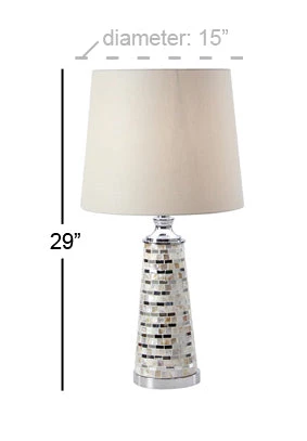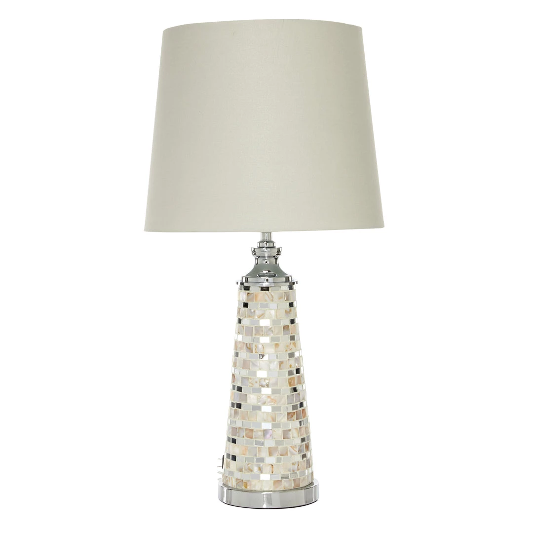 A smart modern piece, this mother of pearl mosaic lamp will garner the compliments. Striking and transitional, it’s topped with a simple off white shade.Â