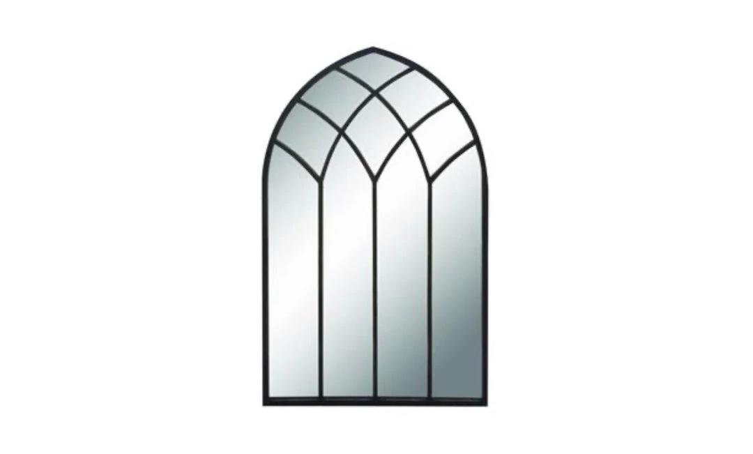 This black metal framed mirror features a stylized cathedral design. A classy addition to many interior styles.