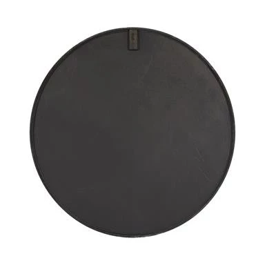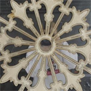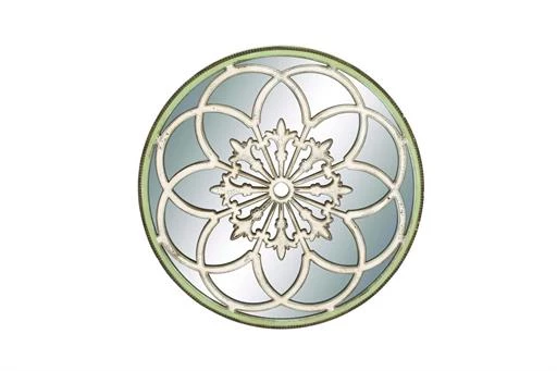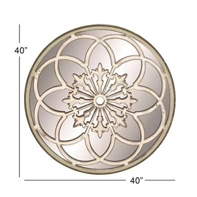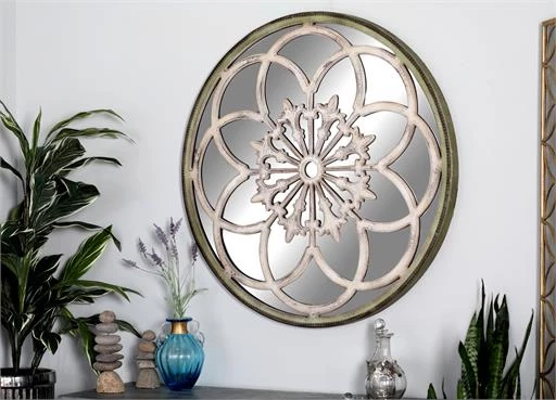 This stunning mirror features a carved wood floral medallion center and mandala- inspired wooden fretwork overlay in a simple round frame. Perfect for an entryway or above a console.