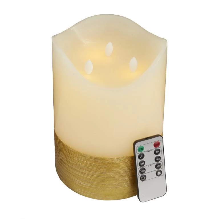 This lavish LED flameless candle features a metallic white and gold wax body finish. This dimmable gold LED candle with remote showcases a cylinder shape with a molten mouth and a luxurious metallic gold bottom finish.