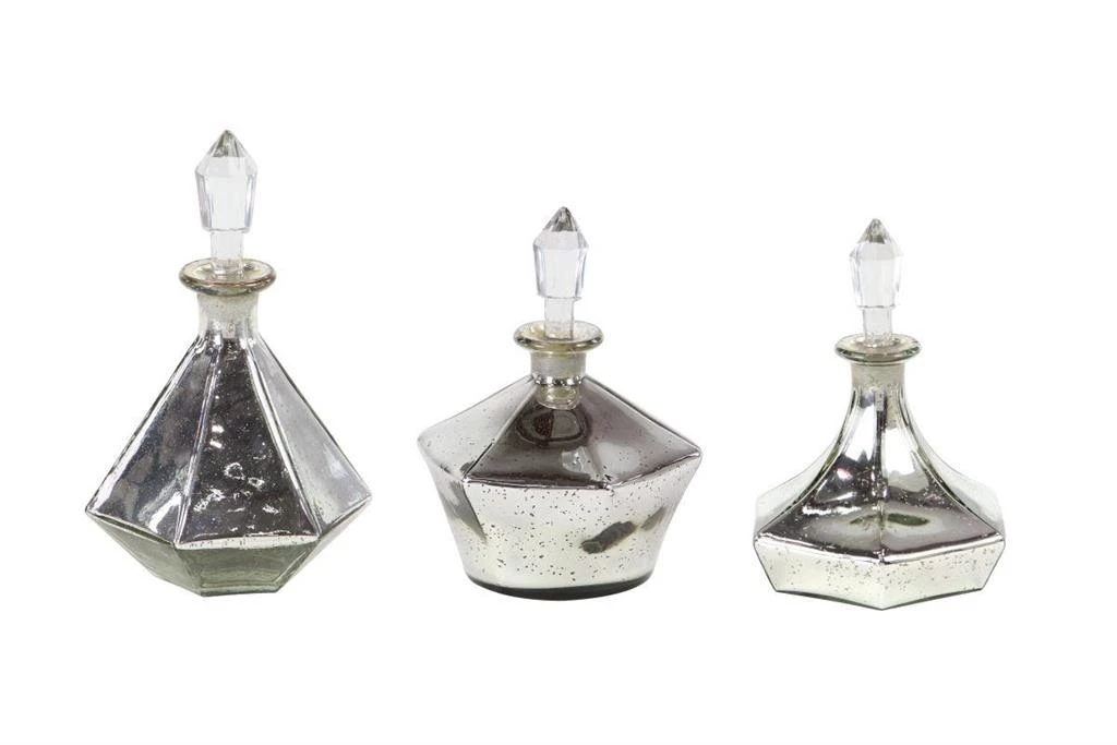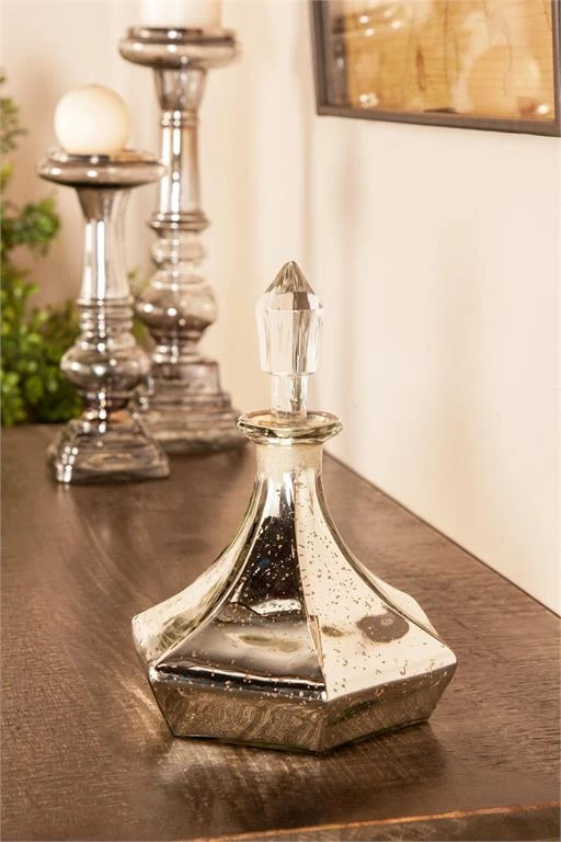 Add a spark of elegance your home with this set of decorative mercury glass bottles. Each bottle features a faceted shape and crystal glass stopper. Sophisticated and glamorous. Remove stoppers and use as stylish vases or fill with essential oils and fragrances. Bottles measure 10″, 10″ and 11″ in height.