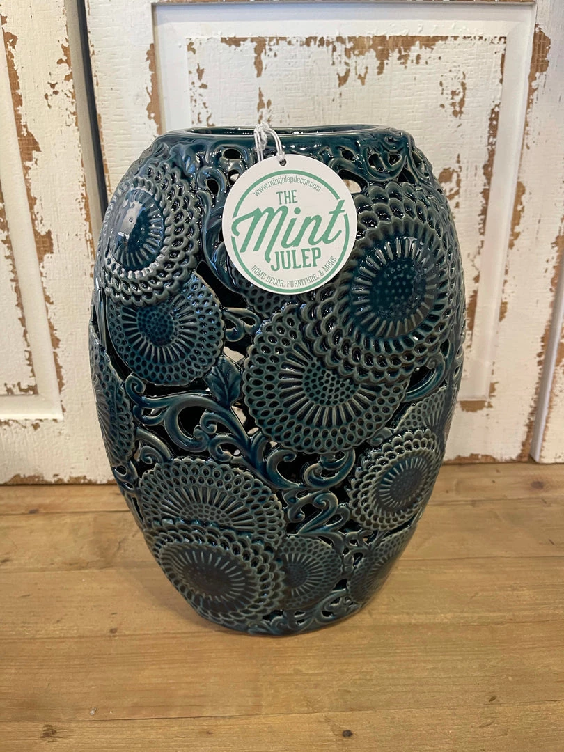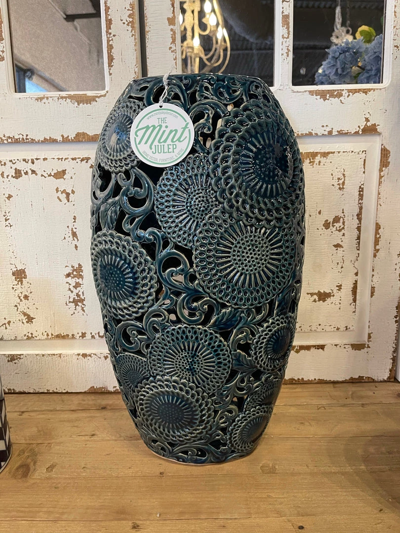 These pierced ceramic vases, with their eclectic style and vibrant blue color, are stunning accent pieces. Display in a coffee table vignette, on a shelf, mantel or console. Let your personality shine in your home! Available in two sizes. You’ll want both!