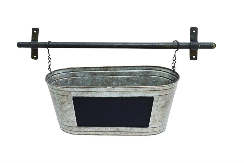 That fresh farmhouse storage/display piece you’ve been looking for. Galvanized tin trough container hangs from an iron bar. Chalkboard label completes the piece and makes your organization easy! Great for playroom, kitchen, laundry room–you decide!