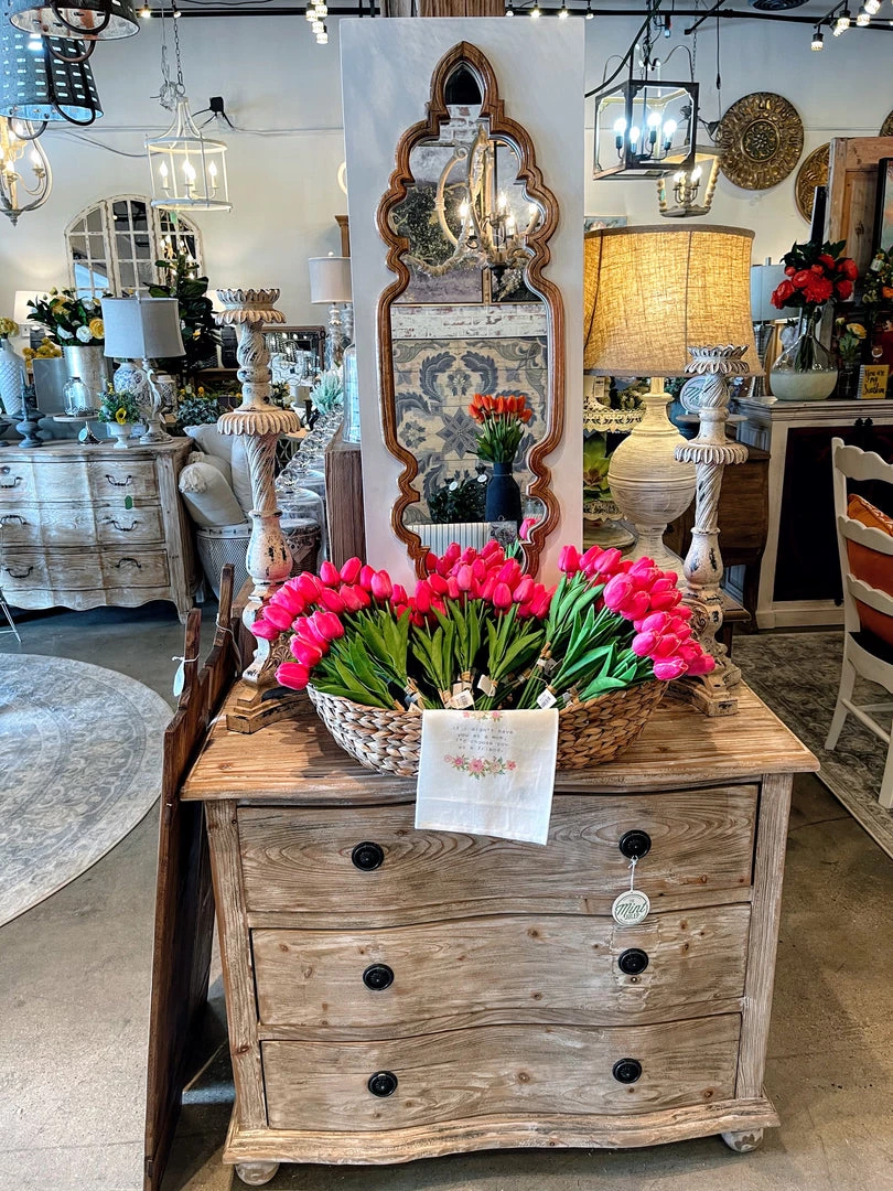 Sensuously curved wood framed mirror with antique gold detailing will add sophisticated style to any room. Imagine it in your foyer, bedroom, or bath.