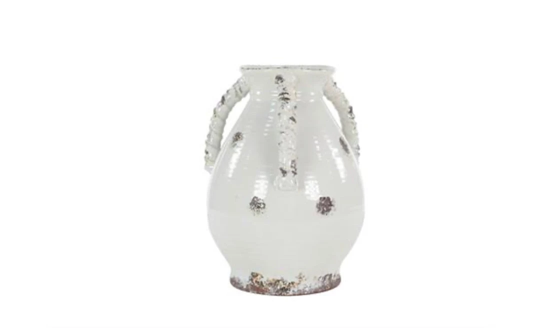 Uniquely shaped and rich in handmade texture, this white ceramic vase features a classic amphora shape with 3 twisted clay handles. The finish is a glossy, opaque white glaze with matte rust detail.