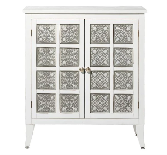 Charming accent cabinet features storage behind two paned doors accented with stamped metal tiles. White painted finish. Bedside table, entry hall piece–so many places you can use this in your home!