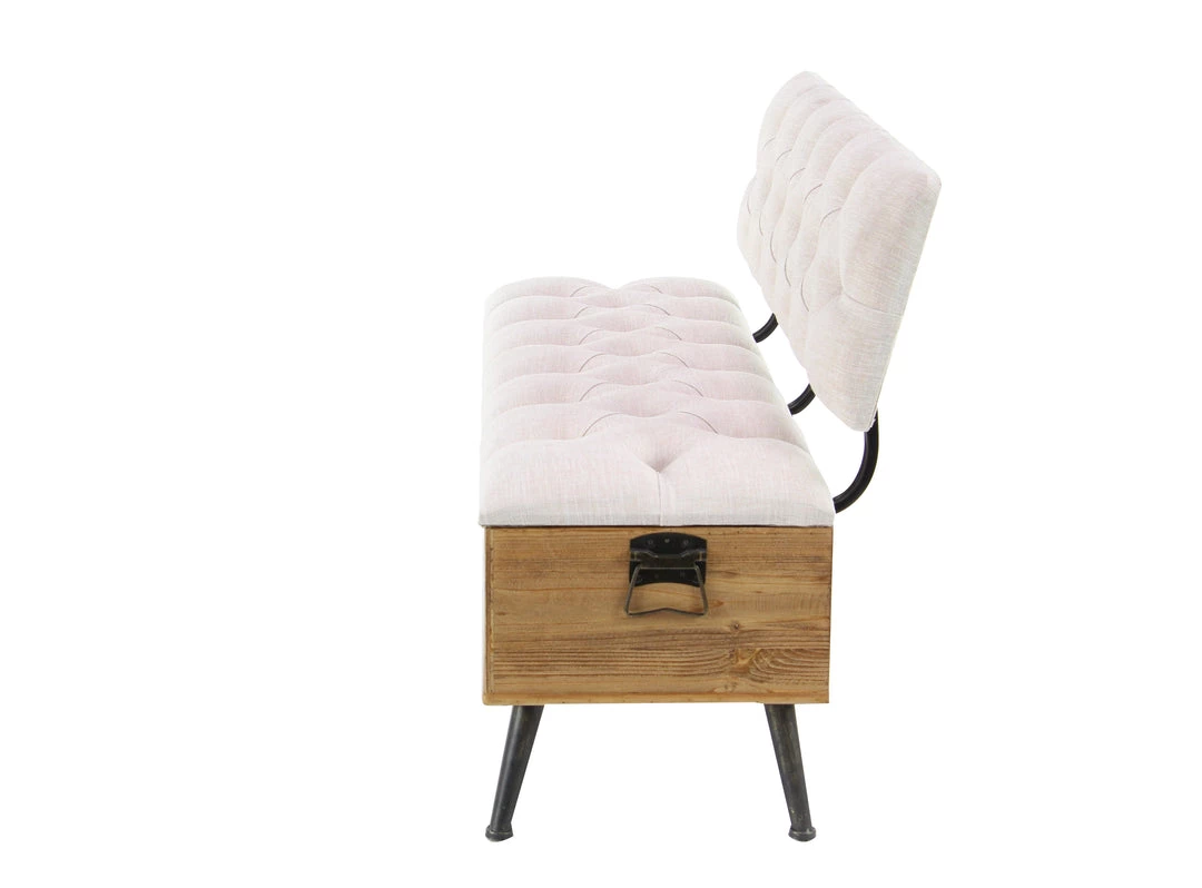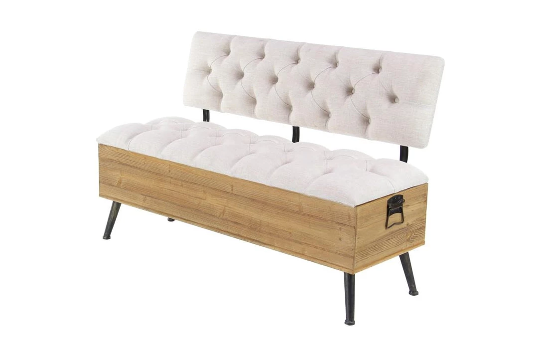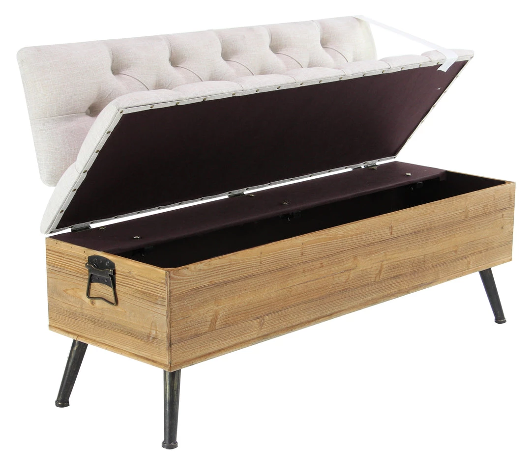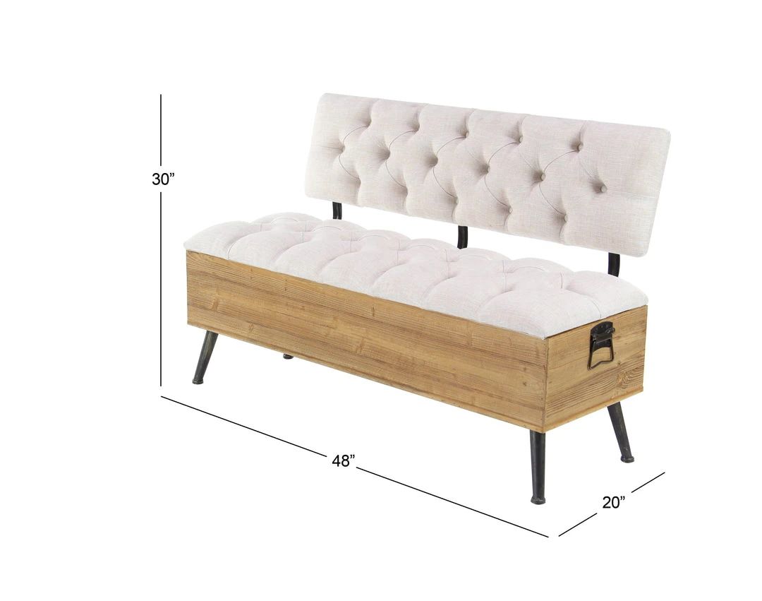 This wood and upholstered storage bench combines organization and comfort. Perfect for entry hall, banquette corner, or anywhere you’d like some small scale extra seating. Features a sleek modern design with tapered legs, tufted upholstered back and lift-up seat for great storage!