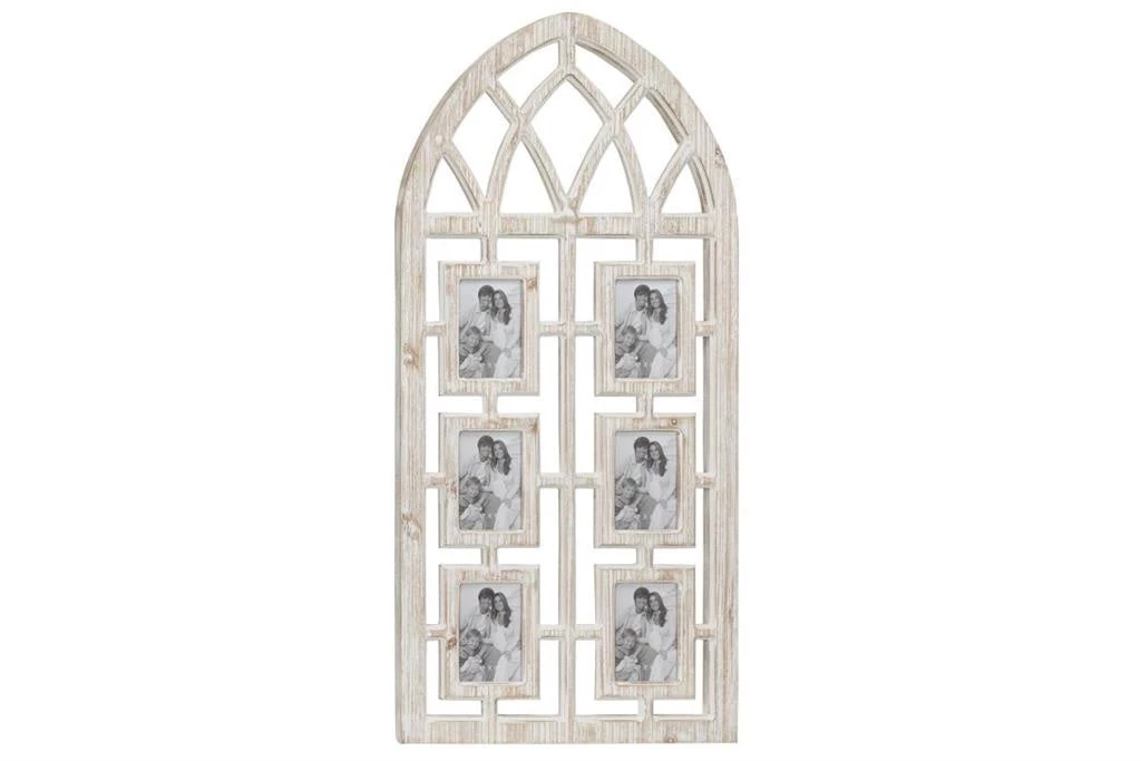 This whitewashed wood photo display window holds six 4” x 6” photos or art prints in a cathedral silhouette. The neutral wood tones work with any color palette while adding dimension to your wall.