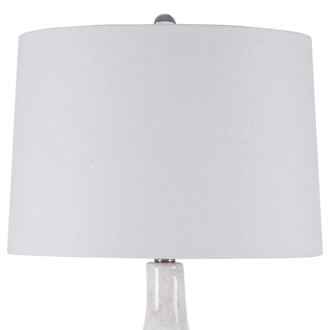 This table lamp features a ceramic base finished in an earthy terracotta rust that transitions into a crackled aged white glaze, accented with brushed nickel plated details and a thick crystal foot. The slightly tapered round hardback shade is a white linen fabric.