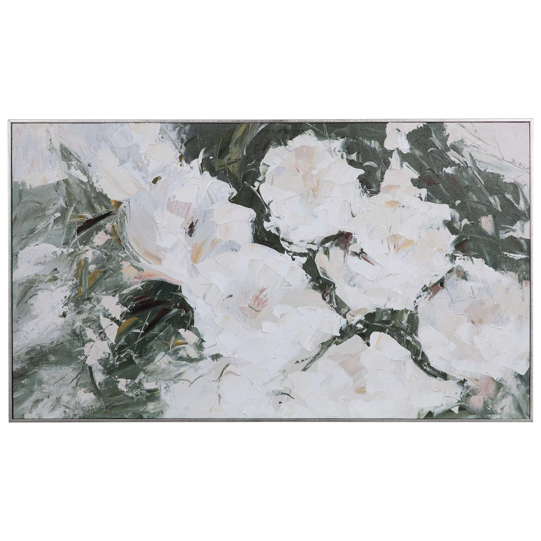 Hand-painted on canvas, this oversize-floral artwork features white and cream tones that pop against a forest green background. This lovely piece is complemented by an antique silver leaf gallery frame. Due to the handcrafted nature of this artwork, each piece may have subtle differences.