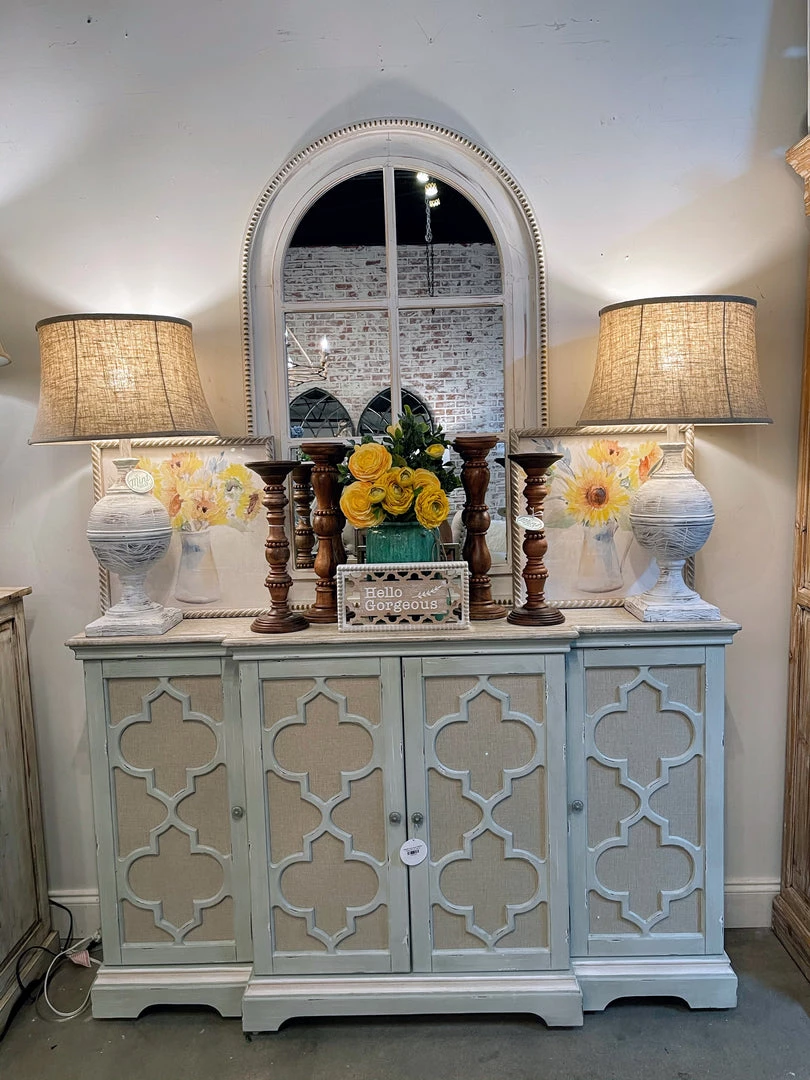 Breakfront console in weathered sea gray with distressed ivory top. Four arabesque fretwork doors are backed with light tan linen for a neutral and classic look. Adjustable shelves within add stylish storage.