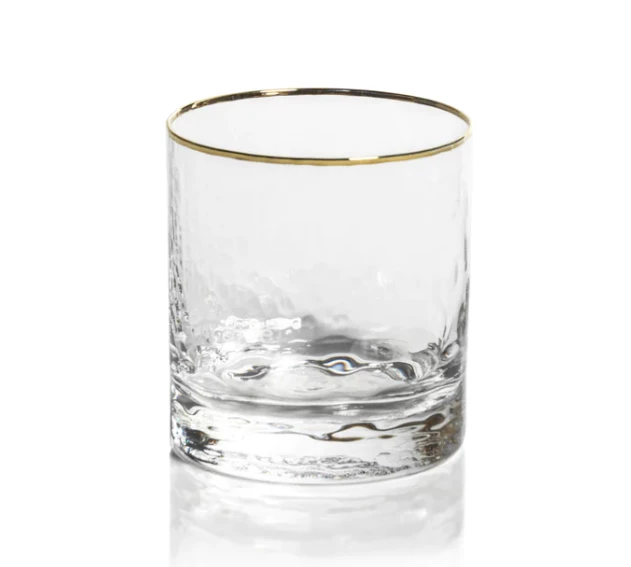 Beautiful hammered double old fashioned glass, clear with gold rim.