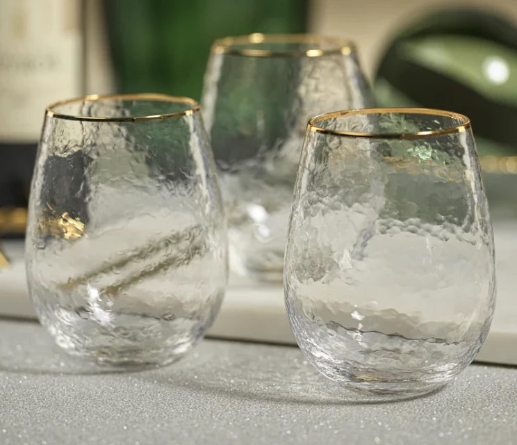 Beautiful hammered stemless all-purpose glass, clear with gold rim.